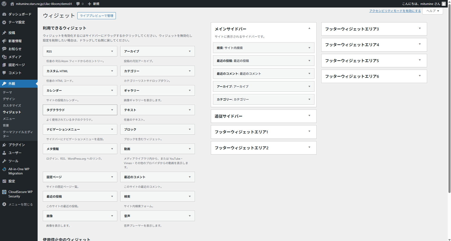 「外観」→「ウィジェット」を選択。「フッターウィジェット1~6」に表示させたい項目を追加しておきます。