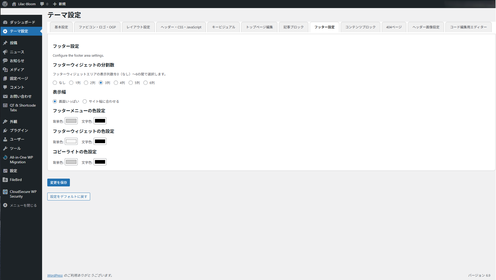 サイトの最下部(フッター)は、サイトの「締めくくり」となる大切な場所です。ここでは、ウィジェットの並び方や、色などの見た目を細かく調整できます。